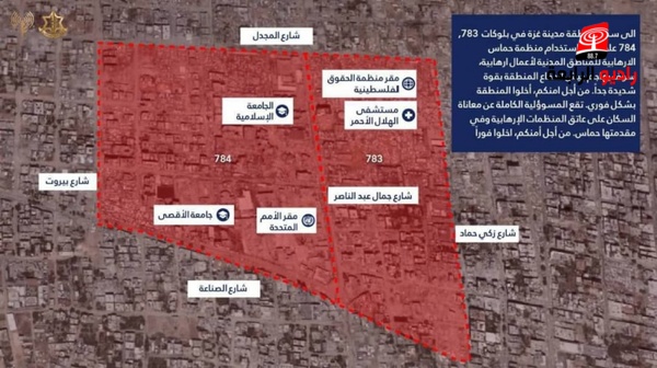 الرابعة نيوز - وجه جيش الاحتلال الإسرائيلي، مساء اليوم الجمعة، إنذارا عاجلا إلى سكان بلوكات 783 و784 في مدينة غزة شمال القطاع.