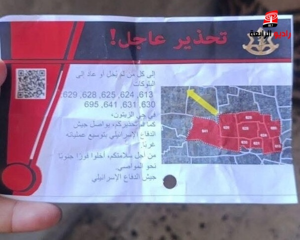 وجاء في المناشير التي ألقيت: "تحذير عاجل! إلى كل من لم يخل أو عاد إلى البلوكات 613, 624, 625, 628, 629, 630, 631, 641, 695 في حي الزيتون، كما تم تحذيركم، يواصل الجيش الإسرائيلي بتوسيع عملياته غربا".
