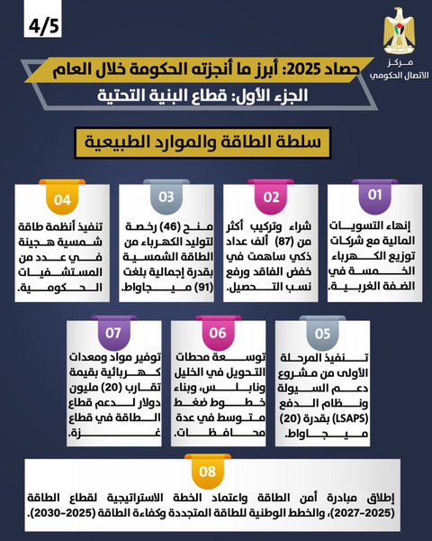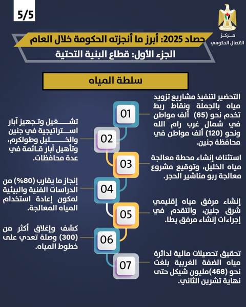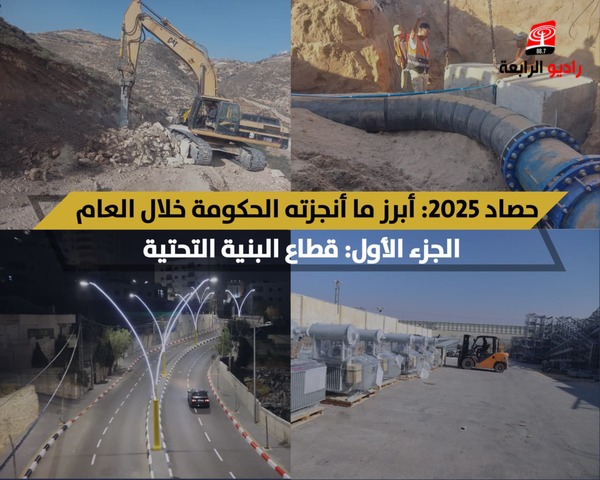 الرابعة نيوز_رام الله - نشر مركز الاتصال الحكومي تقريرًا يستعرض أبرز ما انجزته الحكومة من مشاريع في قطاع البنية التحتية خلال عام 2025، والتي ركزت على الحفاظ على استمرارية الخدمات الأساسية وتعزيز موثوقيتها، على الرغم من الظروف الاقتصادية والمالية الصعبة، والمتمثلة في استمرار احتجاز الاحتلال لموال المقاصة إلى جانب الاعتداءات اليومية. وأوضح مركز الاتصال الحكومي أن هذا التقرير سيتبعه عدد من التقارير المتخصصة التي تتناول ما تم أنجازه خلال العام الماضي في القطاعات الخدمية والتشريعية والاقتصادية مدعمًا بالأرقام والبيانات.