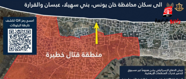 وطالب الاحتلال عبر منشور على وسائل التواصل الاجتماعي، اليوم الاثنين، "الموجودين في محافظة خان يونس، وبني سهيلا، وعبسان، والقرارة، بالنزوح، والانتقال بشكل فوري إلى منطقة المواصي غربا".