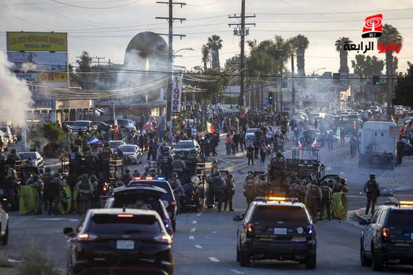 واحتشد آلاف المتظاهرين في وسط منطقة لوس أنجلوس بولاية كاليفورنيا الأميركية وأغلقوا طريق سريع رئيسي وتم إشعال النار في مركبات ذاتية القيادة في الوقت الذي استخدمت فيه قوات إنفاذ القانون المحلية الغاز المسيل للدموع والرصاص المطاطي والقنابل الصوتية للسيطرة على الحشود.