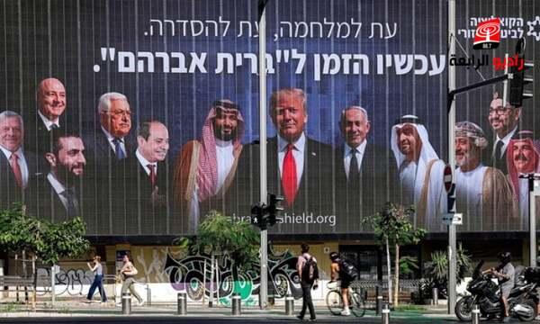 الرابعة نيوز - تداول مستخدمون على مواقع التواصل الاجتماعي، خلال الأيام الأخيرة، صورًا للوحة دعائية ضخمة نُصبت في أحد شوارع مدينة تل أبيب، تضم صور الرئيس الأمريكي دونالد ترامب، وولي العهد السعودي الأمير محمد بن سلمان، إلى جانب رئيس الوزراء الإسرائيلي بنيامين نتنياهو، وعدد من القادة والزعماء العرب، تحت شعار يدعو إلى التسوية الإقليمية.