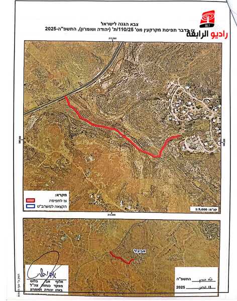 الرابعة نيوز- اعلن جيش الاحتلال، وضع اليد على 3 دنومات من اراضي المواطنين في منطقة واد ماعين بمسافر يطا لأغراض عسكرية.