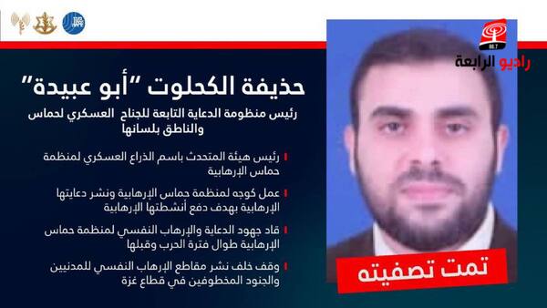 الرابعة نيوز- أعلن جيش الاحتلال الإسرائيلي وجهاز الشاباك، في بيان مشترك، عن اغتيال خُدَيْفَة كَحْلُوت الملقب بـ"أبو عبيدة"، والذي شغل منصب رئيس منظومة الدعاية في الجناح العسكري لحركة حماس.
