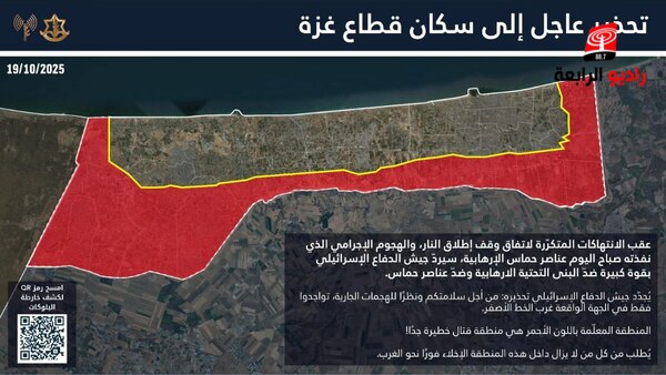 الرابعة نيوز- نشر المتحدت باسم الجيش الاسرائيلي خريطة تطالب الفلسطينيين بالبقاء في المناطق ماوصفه غرب الخط الاصفر وهو الخط الذي انسحب عنده جنود الاحتلال ضمن خطت ترامب.