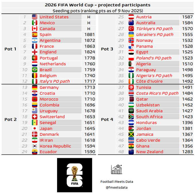 الفيفا يدرس تعديل القاعدة بحيث يتم تحديد تصنيف كل منتخب وفق التصنيف العالمي للفيفا بغض النظر عن طريقة التأهل، ما يعني أن إيطاليا قد تتواجد في الوعاء الأول حتى لو تأهلت عبر الملحق، مما يمنحها فرصة لتجنب مواجهة الفرق الكبرى في مرحلة المجموعات بالمونديال. image.png321 KB