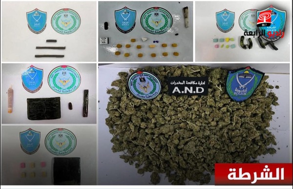 وضبط بحوزتهم مواد يشتبه أنها الحشيش المخدر، وتبغ مخلوط بالحشيش، وحبوب إكستازي، وأدوات تعاطٍ.