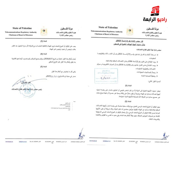 وأكدت هيئة تنظيم قطاع الاتصالات أن هذا القرار يأتي ضمن رؤيتها الرامية إلى تنظيم سوق أجهزة الهواتف الخلوية، والحد من إدخال الأجهزة غير المطابقة للمواصفات الفنية والقانونية، وتعزيز الشفافية والمنافسة العادلة، وضمان حماية المستهلك من خلال توفير خدمات الصيانة الفنية المعتمدة وقطع الغيار الأصلية للأجهزة المتداولة في السوق الفلسطيني، وبما يحقق المصلحة العامة ويخدم المواطنين في دولة فلسطين.