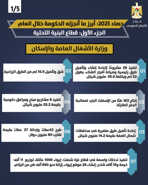 الرابعة نيوز_رام الله - نشر مركز الاتصال الحكومي تقريرًا يستعرض أبرز ما انجزته الحكومة من مشاريع في قطاع البنية التحتية خلال عام 2025، والتي ركزت على الحفاظ على استمرارية الخدمات الأساسية وتعزيز موثوقيتها، على الرغم من الظروف الاقتصادية والمالية الصعبة، والمتمثلة في استمرار احتجاز الاحتلال لموال المقاصة إلى جانب الاعتداءات اليومية. وأوضح مركز الاتصال الحكومي أن هذا التقرير سيتبعه عدد من التقارير المتخصصة التي تتناول ما تم أنجازه خلال العام الماضي في القطاعات الخدمية والتشريعية والاقتصادية مدعمًا بالأرقام والبيانات.