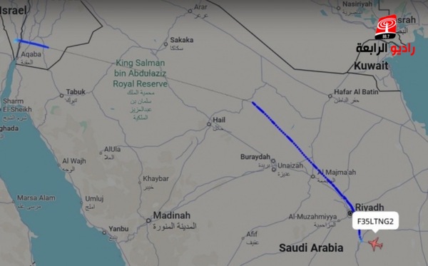 الرابعة نيوز _كشف موقع Flightradar24 لتتبع الطائرات أن مقاتلة أمريكية أو اسرائيلية من طراز إف-35 جرى تتبعها بشكل علني وتم مشاهدتها على الموقع وهي متجهه إلى السعودية.
